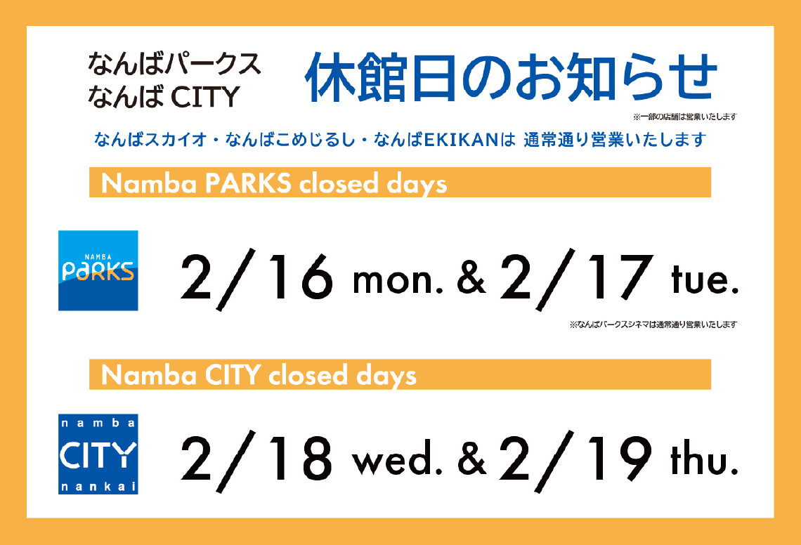 - なんばCITY 2月休館日のお知らせ 2/18・19