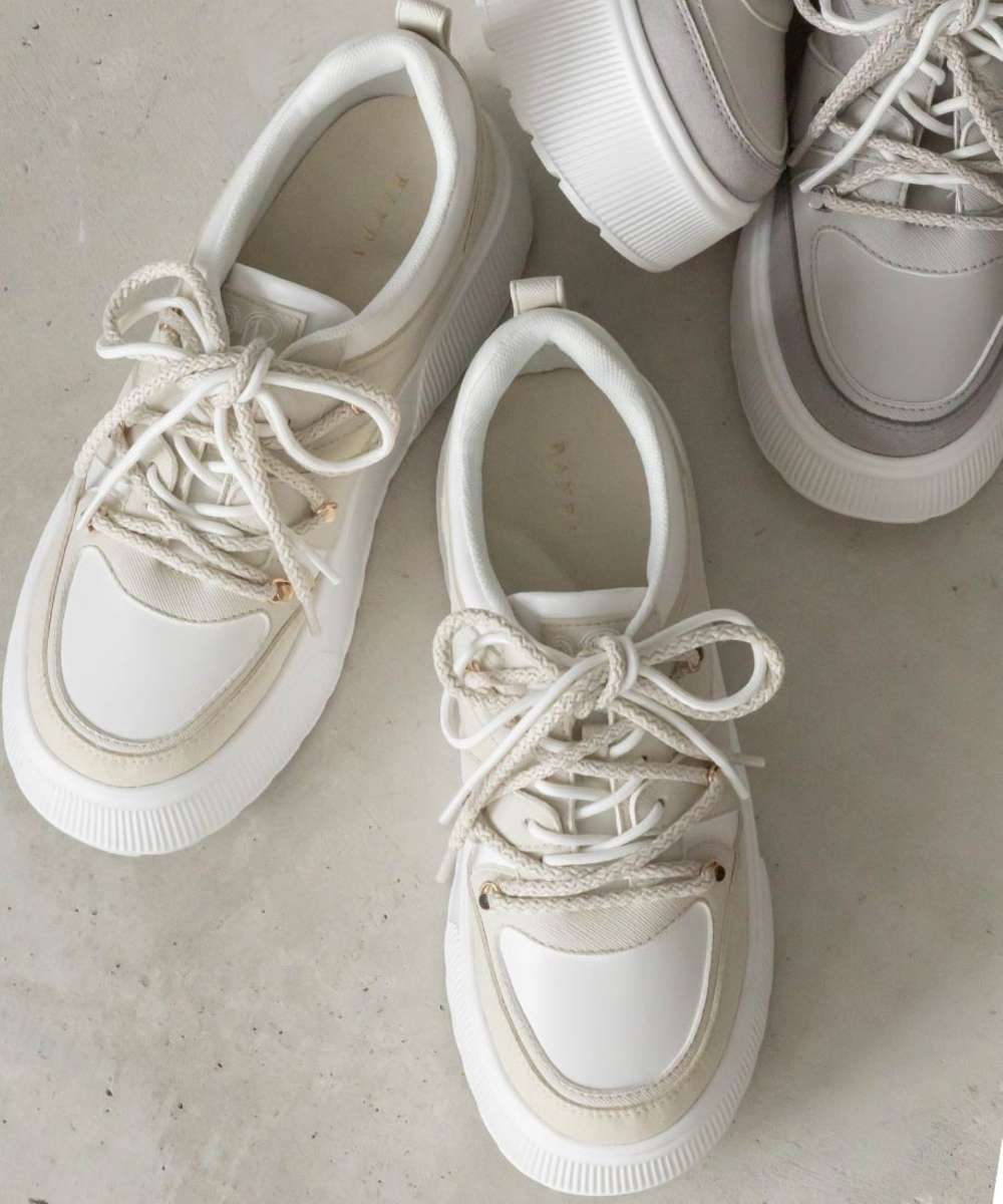 お問い合わせ番号:PH37080 J 二重に結んだリボンがキャッチーなボリュームソールスニーカー。 落ち着いた上品な配色で、カジュアルになりすぎず大...