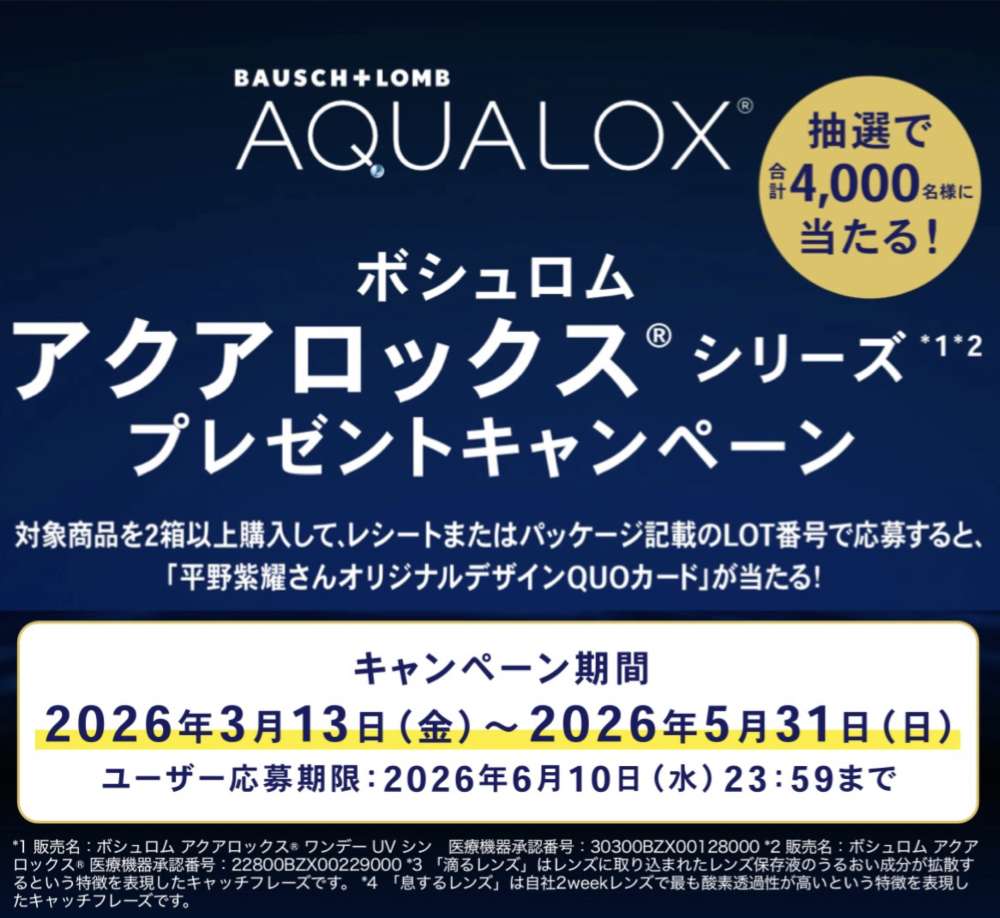 ボシュロム【アクアロックス】シリーズプレゼントキャンペーン🎁 対象製品を2箱以上ご購入後、応募すると抽選で合計4,000名様に 『平野紫耀さんオリジ...
