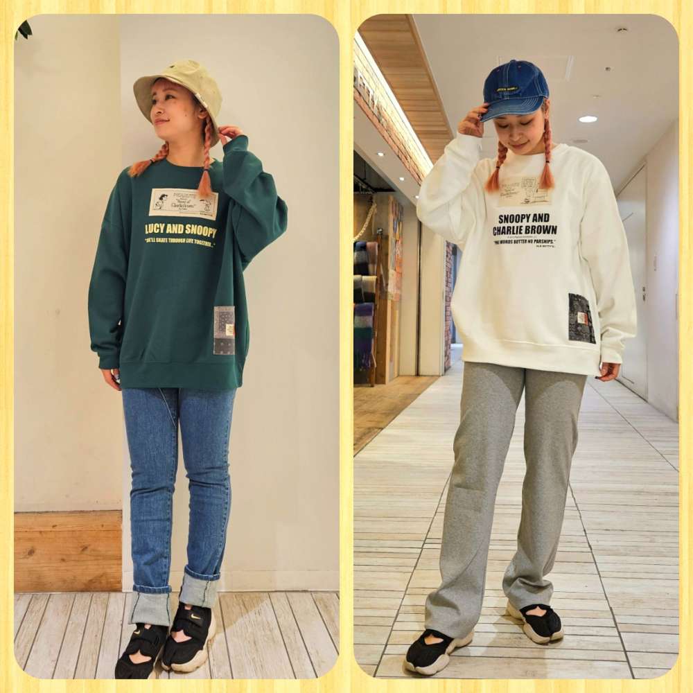 スヌーピーアイテムからトレーナーのご紹介です。 ビッグシルエットの形で、肩周りはドロップショルダーなので女性でも男性でも着用でしていただけるサイズ感と...