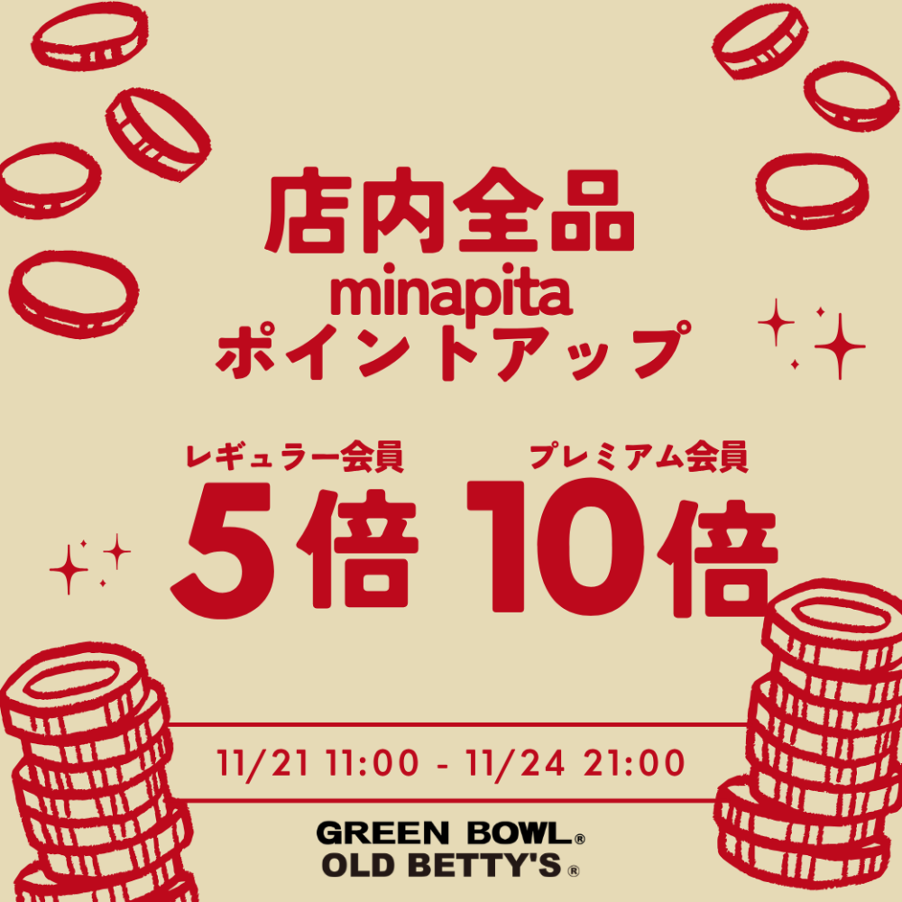 ミナピタポイントアップが開催されます♫ 期間は11月21日(金)~24日(月・祝)の4日間です! ぜひこのお得な期間に欲しかったアイテムをGETしてく...