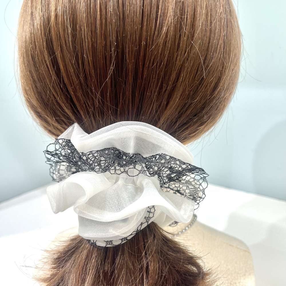 ふんわりとしたシアー素材に、 繊細なレースを重ねた華やかシュシュ。 ボリューム感のあるフリルが、 シンプルなまとめ髪も一気に女性らしい印象に仕上げてく...
