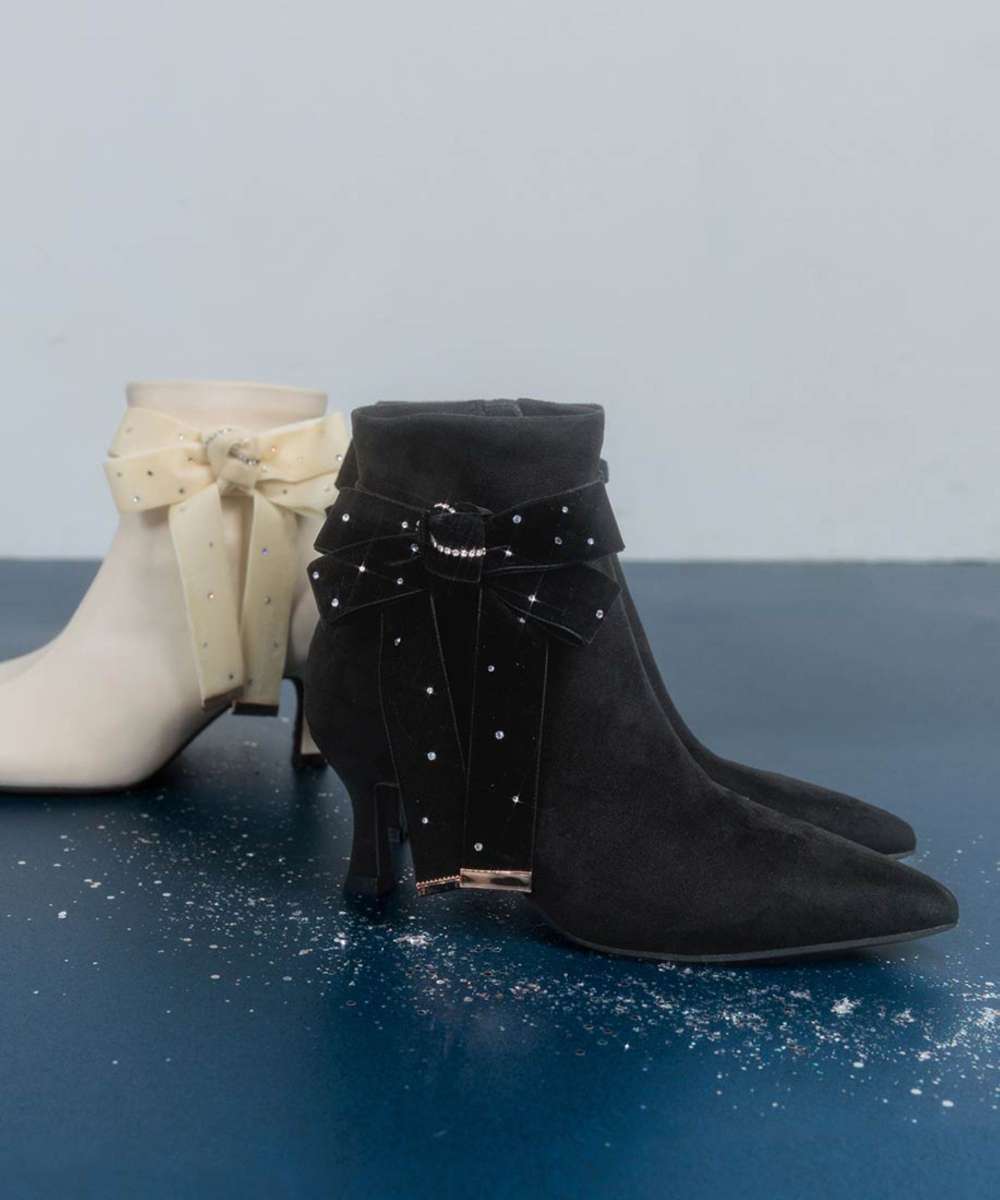 お問い合わせ番号:PC36265 J 華やかなビジューベロアリボンが印象的な2WAYショートブーツ。 シーズンムード高まるデザインで、冬の装いに彩り...
