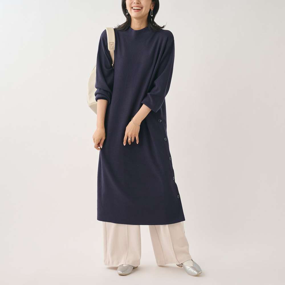 サイドボタンがアクセント!1枚でスッキリ優秀ニットワンピース