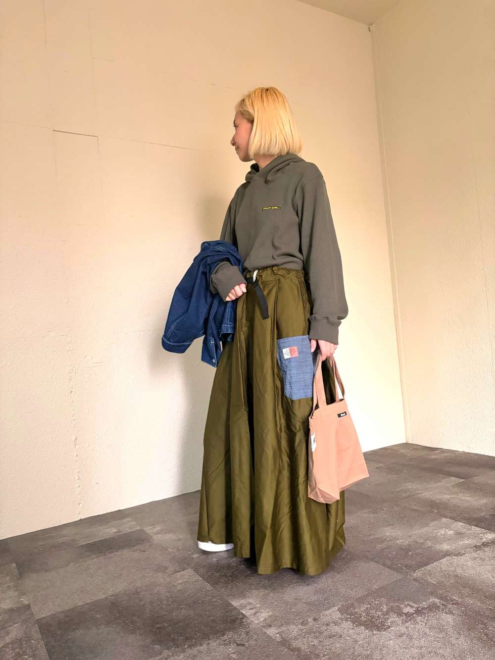 春らしいおでかけスタイル。 ストレッチ抜群のリブロンTに軽やかなボリュームスカート。 肌寒くなったらオーバーサイズのデニムジャケットを羽織ります。 ミ...