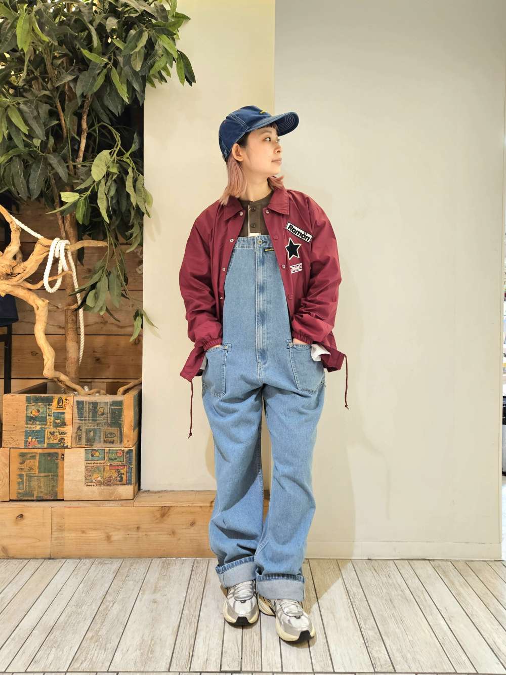 ベージュのナイロンプルパーカーに厚手生地のチェックシャツ。 ボトムスもグリーンカラーで合わせ落ち着いた組み合わせに。 ポイントにスヌーピーデニムバッグ...