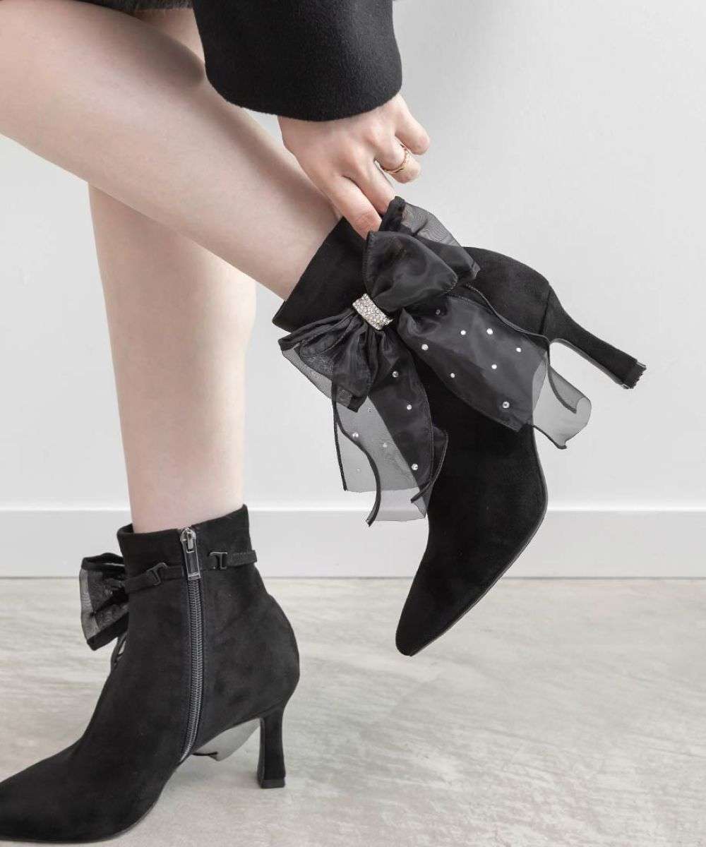 お問い合わせ番号:PC36240 Y 煌めくビジューxシアー素材のリボンが付いた2WAYショートブーツ。 すっきりとした美シルエットとフェミニンなリ...
