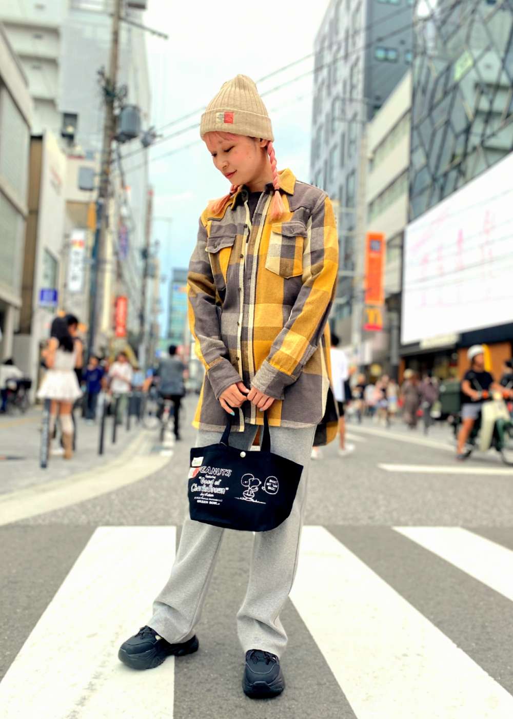 ロングチェックシャツのマスタード。秋を感じさせるカラーリングです★ ボトムにリブパンツで動きやすく、ちょっとした買い物にはSNOOPYミニトートを。 ...