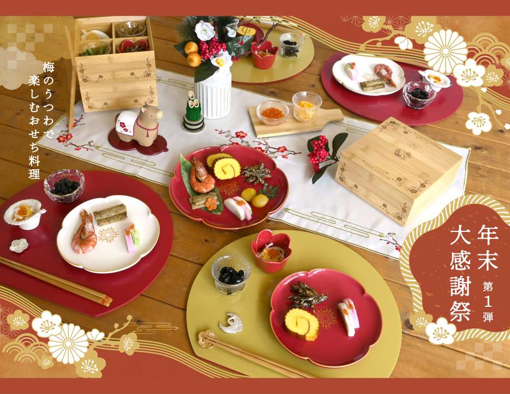 ゴールドの縁が高見えする梅のお皿には、紅白なますや黒豆、栗きんとんなどを盛っておせち風プレートに♪
